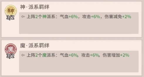阵容羁绊说明如下:当战场上有2位神派系角色同时出战时,全体角色将获得6%的气血提升、6%的攻击加成以及2%的伤害减免效果;若战场上同时有2位魔派系角色上阵,则全体角色可享受到6%的气血加成、6%的攻击提升与2%的伤害增加效果。
