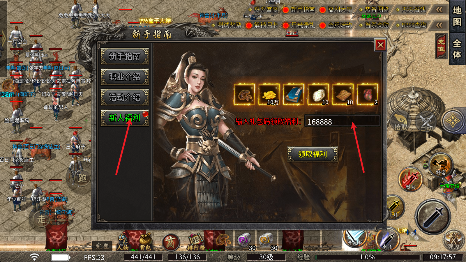兑换方式:点击上方的新手指南,接着选择新人福利,最后在输入框内输入礼包码就可以了。