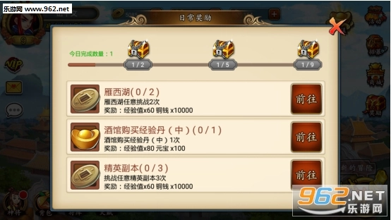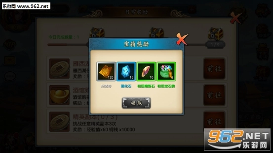 一天下来总共可以拿到740点经验、50000铜钱和500元宝!另外,每完成3个任务就能打开一个每日宝箱,宝箱里也有
