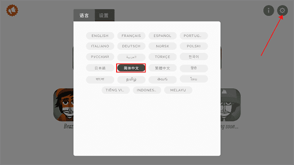 2. 轻点右上角的齿轮图标,即可进行语言切换操作,能够将游戏设置为简体中文。
