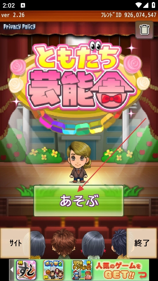 1. 开启游戏,待看到「ともだち芸能舎」标题界面后,点击绿色的「あそぶ」按钮,随即进入游戏主场景。