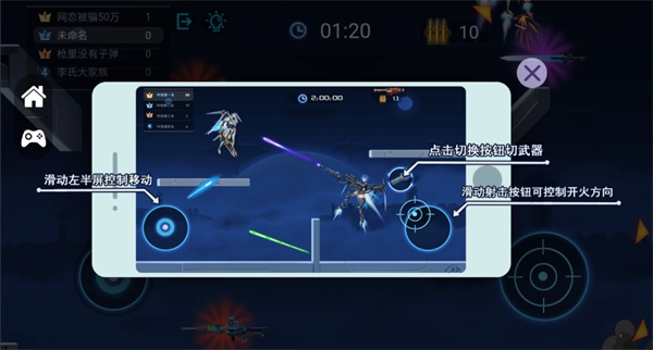 点击屏幕上的按键来切换武器;通过滑动左半屏控制移动;滑动射击按钮能够调整开火方向。
