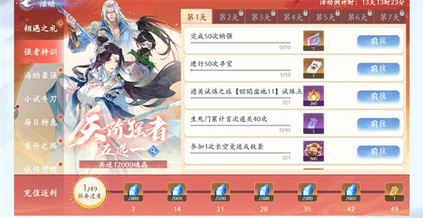 完成新手七日任务,能助力您迅速熟悉游戏内容。这些任务操作简单,奖励还十分丰厚,只要完成全部任务,就能获得天阶角色五选一的机会!