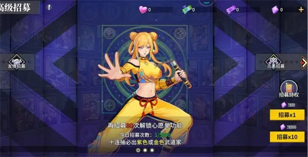 元素招募和高级招募的十连抽,保证能抽到紫色或金色品质的武道家。有收集强迫症的玩家也不用担心,只要稍微花点功夫,就能把图鉴收集完整啦。