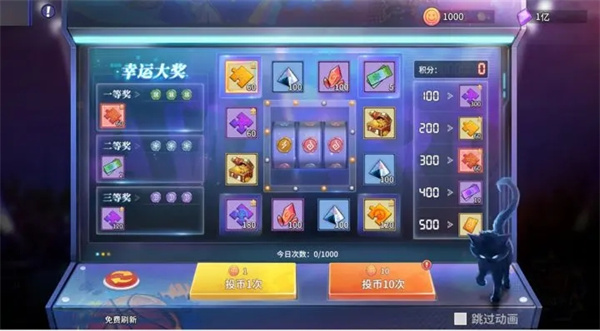 玩家能够在【街机厅】投币参与抽奖活动,该活动设有【普通抽奖】与【高级抽奖】两种类型,奖池内包含4个大奖以及8个小奖。要是抽到三种相同的元素,还可以额外获得幸运大奖!每次抽奖都会累积积分,当积分达到特定数值时,也能领取对应的奖励。