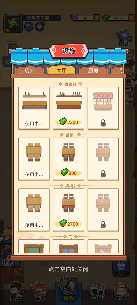 在梦想寿司店里,玩家能够按照自己的心意搭配各式各样的桌椅与装饰,打造出风格各异的包间,以此吸引更多食客前来就餐。