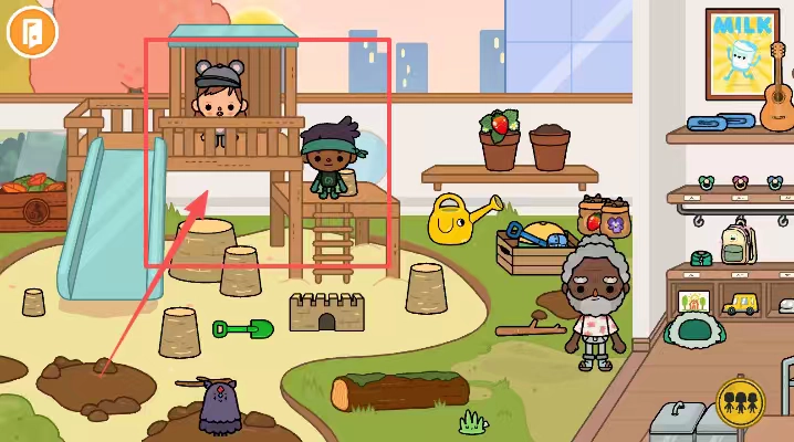 看左边的木制滑梯和树屋,点击两个孩子旁边的沙堆,拿玩沙工具来堆沙子玩。