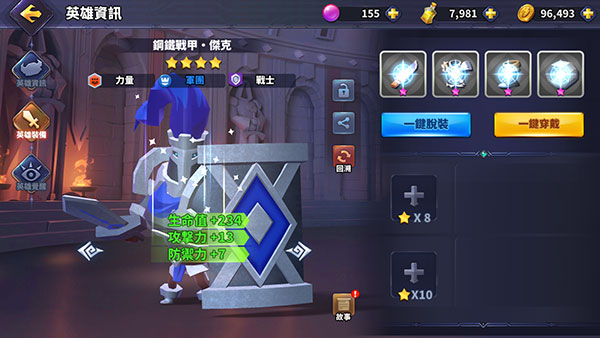 切换至装备界面后,还能为英雄更换装备,从而提升其相应属性。