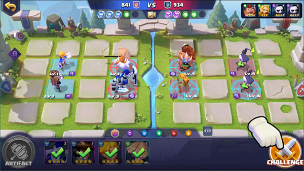 战斗开启后全程无需手动操作,我方阵营会与敌方阵营自动展开战斗,当蓝条积满时也会自动释放技能,这一机制和大家熟悉的自走棋玩法颇为相似。