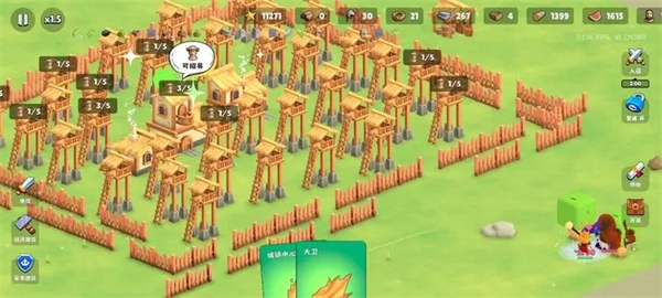 4、如图在三个建筑周围用木墙围两层,中间填满哨塔。第一次入侵前把木墙的防御和血量点得高一些,预留100件木制装备就可以了。