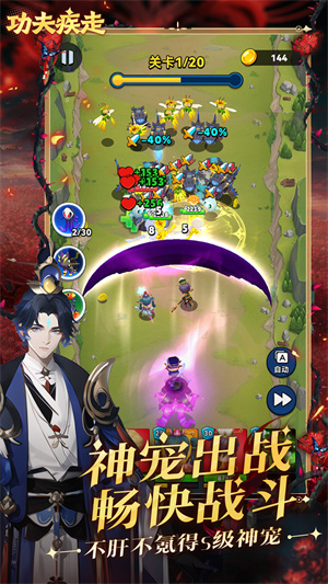 功夫疾走拥有新颖的玩法与精美的画面,内容上借鉴了《西游记》和《三国演义》两部经典名著。游戏里有各种各样的宠物,每只都具备独特的属性。玩家只需在战场上布置自己的角色,就能自动开启对战。尽管玩法十分简单,却十分考验玩家的策略规划能力,感兴趣的朋友不妨一试。