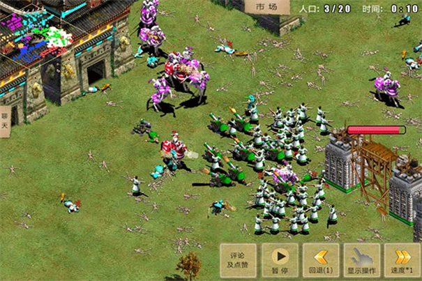 1.尝试持续生产农民和收集资源。(注:基地、箭塔等可以作为农民的临时庇护所,敌人来袭时,请及时避难。