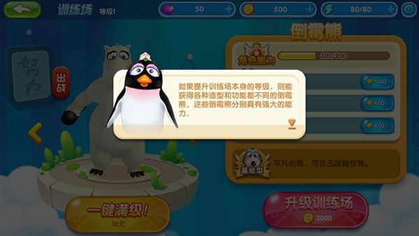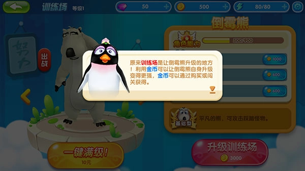 训练场是倒霉熊提升等级的场所,借助金币能够让它变得更强大,这些金币既可以通过购买获取,也能在闯关过程中得到。