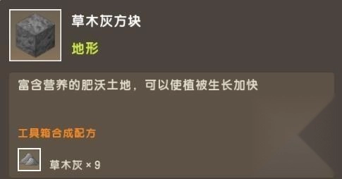 草木灰方块的获取方法是:把苔藓球放入熔炼炉进行熔炼,得到草木灰后再合成方块。这种方块含有丰富的营养成分,作物种植在它上面,生长速度会比种植在普通土块上更快。