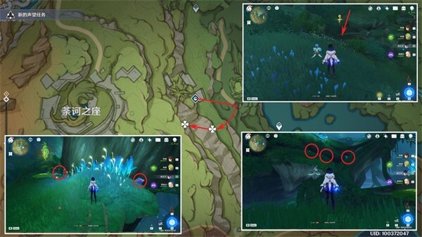 降诸魔山洞窟,大部分位于上层平台或藤蔓区域,借助四叶印可快速收集,总数为6个。