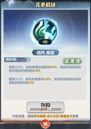 游戏里的异兽最多能上阵四个,因此最多能激活两种元素羁绊。通常推荐的羁绊组合是摄雷加借风,只要上阵两只风元素异兽和两只雷元素异兽就能达成这个效果。