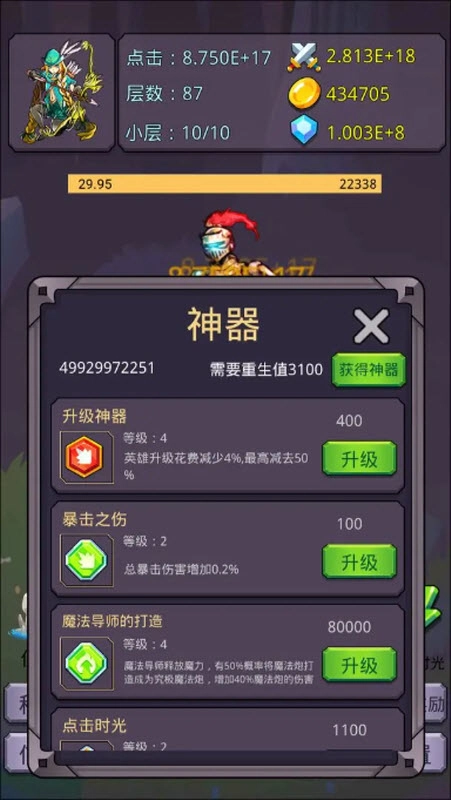 点击神器:点击伤害每级提升100%,满级为5000级。