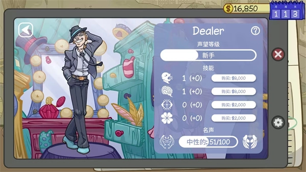 主角具备魅力、能力、洞察力、运气这四项技能属性,它们各自的作用是:助力你更出色地议价、更精准地估价、更细致地为客户画像、争取到更多交易机会,别忘了持续提升这些属性哦。