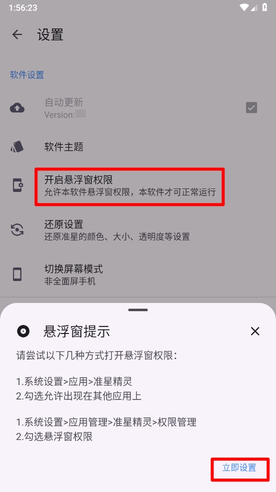 最后还能进入设置页面,点击“开启悬浮窗权限”,此时会弹出提示框,接着点击“立即设置”进入对应界面打开权限就可以了。