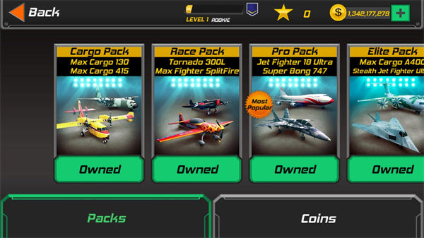 左右滑动即可看到所有飞机,花费金币即可进行购买。