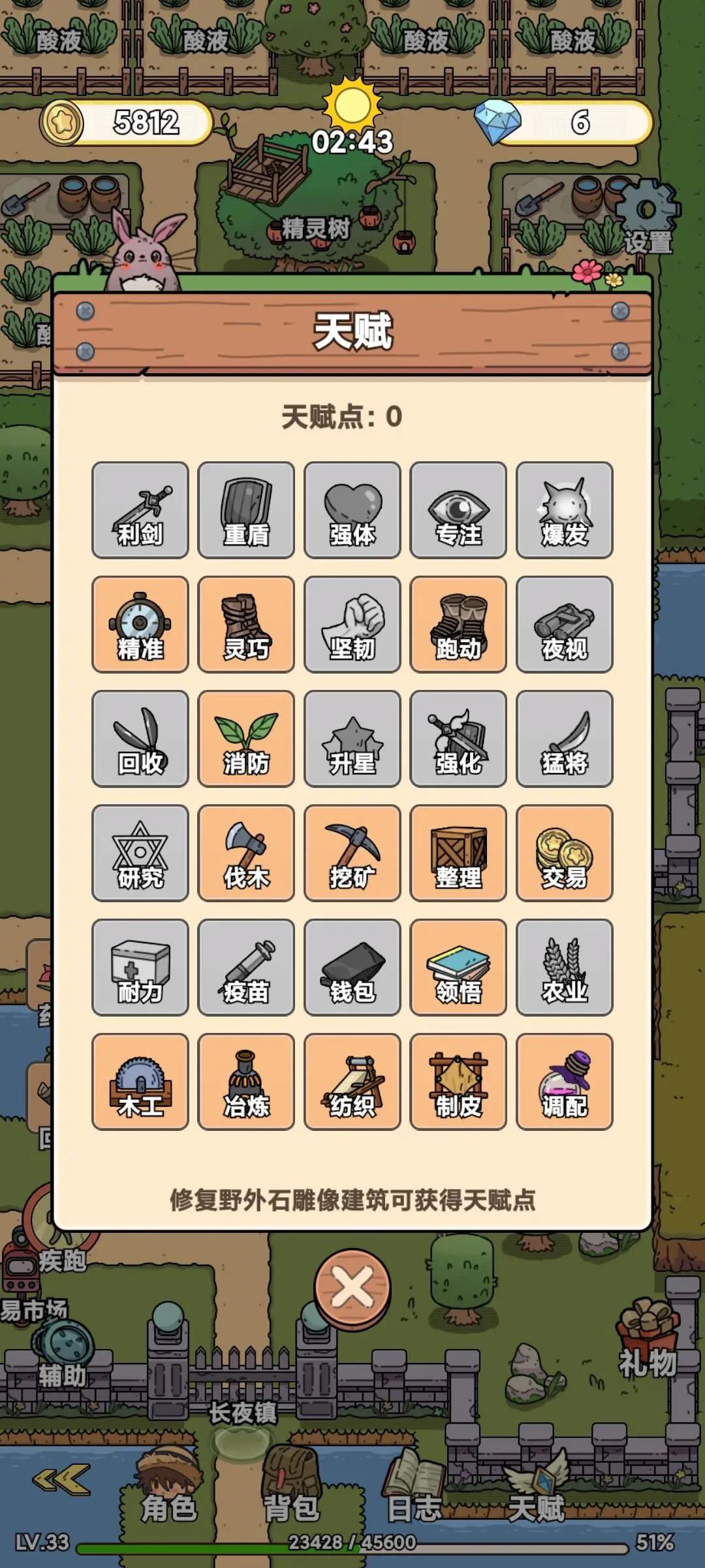 天赋加点规则如下:玩家可通过修复野外石像来获取点数,石像修复完成后将不再显示名称,所需的具体修复材料可在日志中点击查看。在加点策略上,建议优先选择最后一排和第四排的天赋,这样能够有效节约木材这一基础资源,同时减少金币的消耗。我的个人加点方案如图所示。