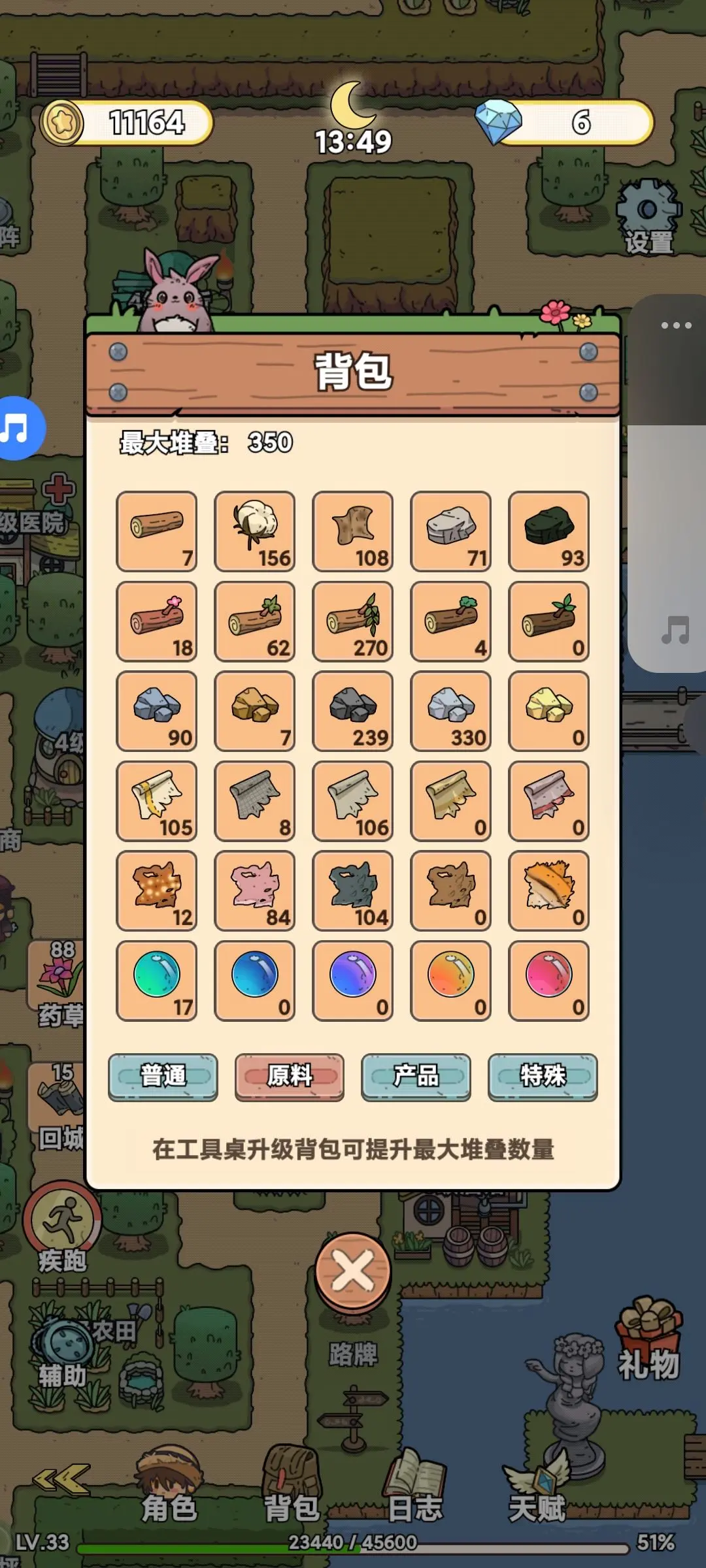 背包可借助工具桌完成升级。点击背包左上角,能看到最大容量的显示。打个比方,要是你通过看广告的方式已经把背包上限内的木头都刷满了,那之后就只会出现金币和经验,不会再获得木头了。