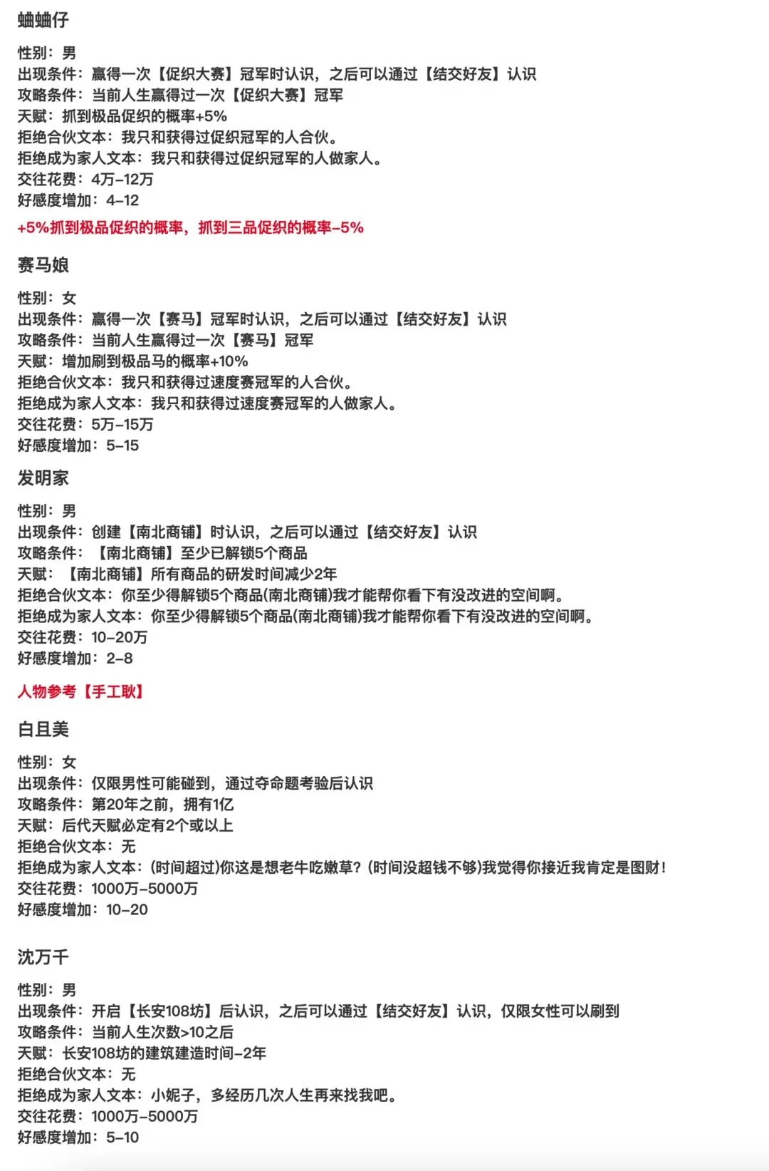 快速挖矿的玩法会让人生进程加快(只买矿然后直接进入下一年),而稳扎稳打体验完整人生的话,平均下来能攒到5000勾玉(不过天赋点不能乱加,这很关键,目前只有成就系统能赚勾玉)。大概一个多小时就能解锁军营(需要先建11个建筑)。勾玉攒够后,解锁108坊需要5万声望,这点其实一世就能达成:房子和马车都买最好的,这样直接有48500声望;科举时查一下答案,全对当状元能拿500声望;最后和师妹结婚,她的天赋能每年加20声望,生10个孩子每年能加220声望,10年就是2200声望,结束前肯定能凑够5万声望解锁108坊了。虽然下一世这些声望会清零,回到48500,但没关系,后面已经没有需要声望的地方了。对了要注意,每年的收入必须是正数才能拿到大量勾玉奖励,最好不低于100亿。
