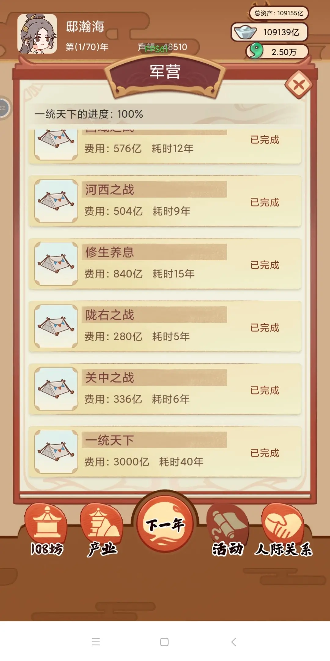 这游戏里的军营系统实在没什么意思,无非是领点资源,熬上几代人,差不多到第五世就能统一全国了。游戏进程快得离谱,可能第一天就能通关,玩完基本就可以卸载了。