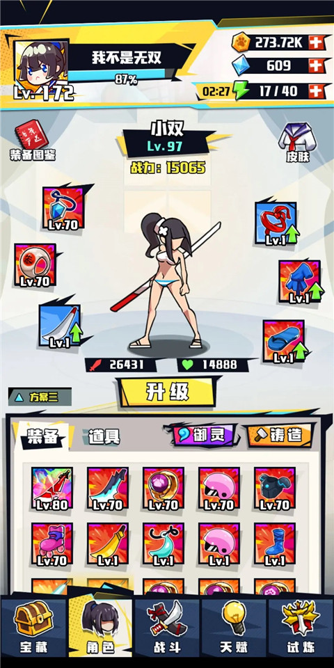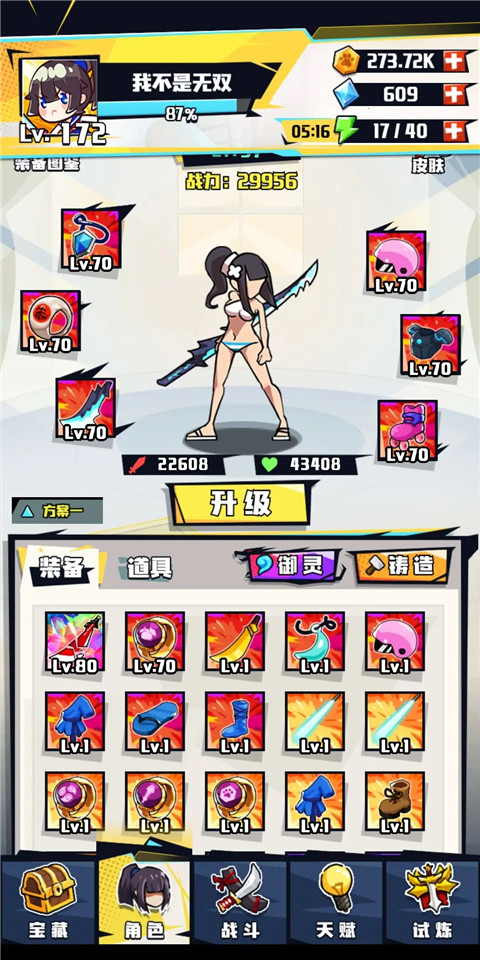 武器方面,每把刀都有其独特之处,无论是升级还是彩装效果都很出色。白刀在金币关卡中,一个无双就能砍倒五个敌人,这一点懂的玩家自然明白。血刀在前期爬塔时,只要不被敌人秒杀,就能凭借持续伤害把怪物慢慢磨死。黑刀的无双技能冷却快、伤害高,还能享受多种属性加成,暴击、爆伤、奥伤都能有效提升它的输出,而且可以打断BOSS的技能,不过它的前摇较长,对付灵活的怪物时会比较棘手。到了后期装备成型后,黄刀和绿刀也能有不错的表现。而赤影则是目前最难获取的武器。