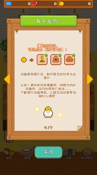 获得金币后可以点击设备升级,设备升级后,制作面包的效率也会提高!比如小麦的收获数量翻倍,烤面包的时间缩短,店内的摆放栏增加等等。不断提升设备等级,让面包店经营更加顺利便捷吧!