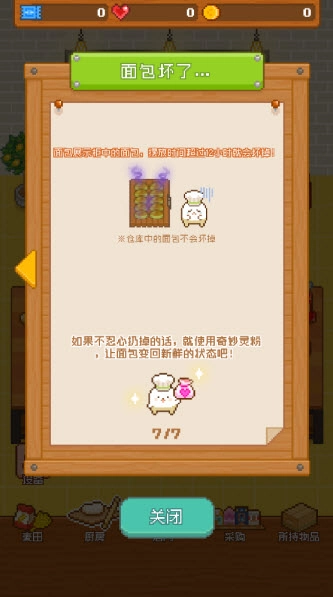 面包展示柜里的面包,放置超过12小时就会变质,要是舍不得丢弃,不妨用奇妙灵粉让它恢复新鲜!不过仓库里的面是不会坏的。