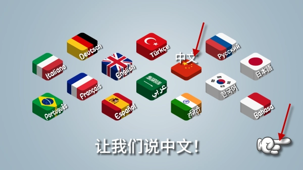 进入后可以选择多种语言,选好中文后,点击右下角的手指图标就完成了。
