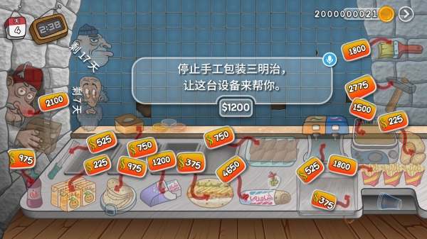 等攒够了金币,我们就能升级更多器械了。这样不仅能提升效率,还能增加收入,不过要特别注意,包装袋千万别升级!