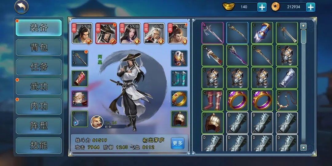 主线推进到苗疆后成功招募了文韬,目前阵容已经组建完成。(张三丰会赠送武当的C级秘籍套餐,这里说明一下,没有D级的,而且C级的获取也颇费周折)