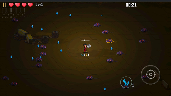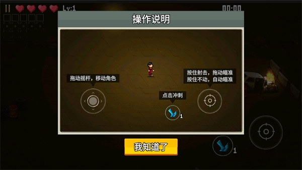 进入游戏后,玩家能借助摇杆操控角色移动,点击鞋子形状的按钮可躲避怪物,点击瞄准按钮则能进行射击。