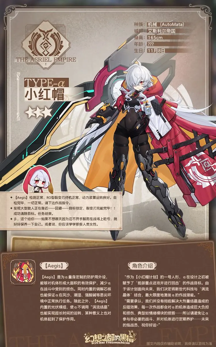作为【小红帽计划】的首个人形,α在设计之初就被设定了“抵御重点进攻并实施反击”的作战目标。鉴于该计划着眼于未来,我们决定把新世代科技与“涡流晶体”相融合,以最大程度地激发α的作战潜能。