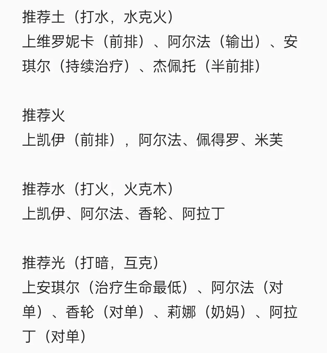 根据自身拥有的角色池,提前规划好针对不同属性敌人的合理队伍配置。举个例子,像这样: