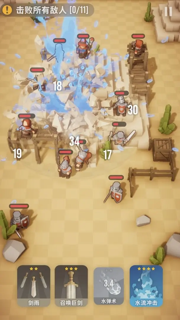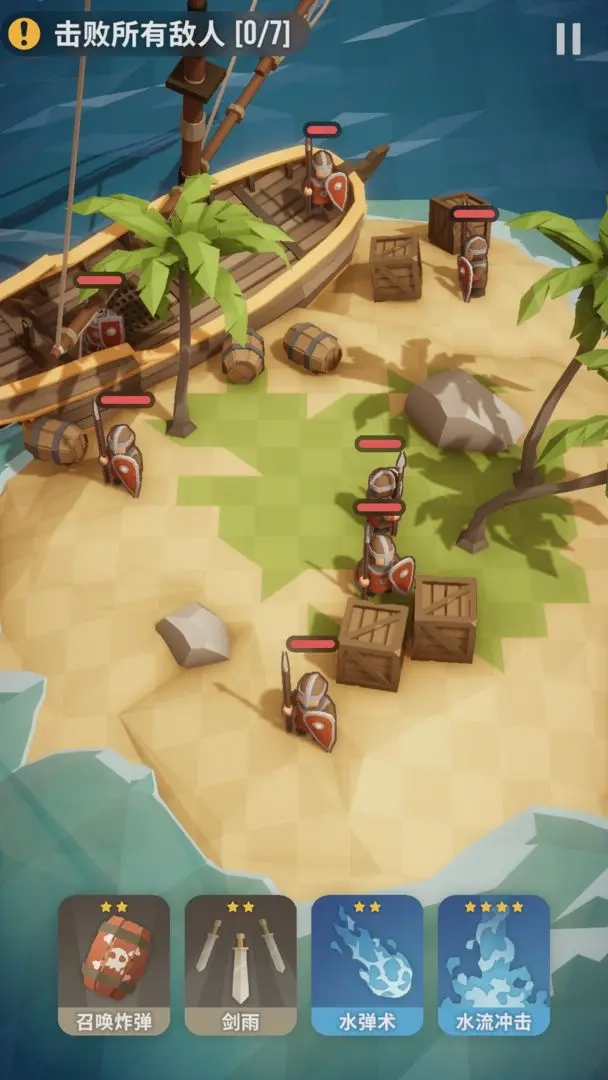 这关需要控制我方小兵的伤亡情况,所以当我方小兵血量降到一半时,要使用大治疗技能,并且务必在半血时释放;水流冲击技能是用来摧毁雕像的,必须放在雕像身前,放在头顶没有伤害,这应该是个BUG。