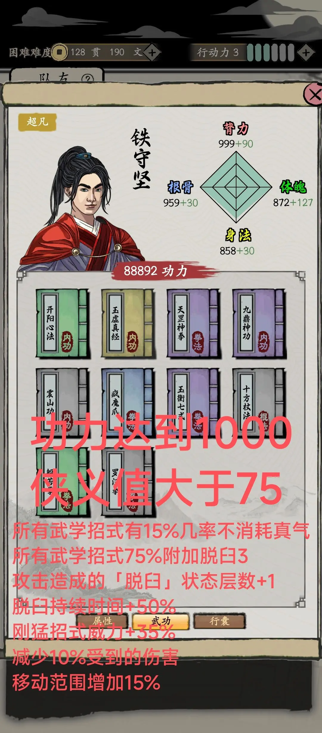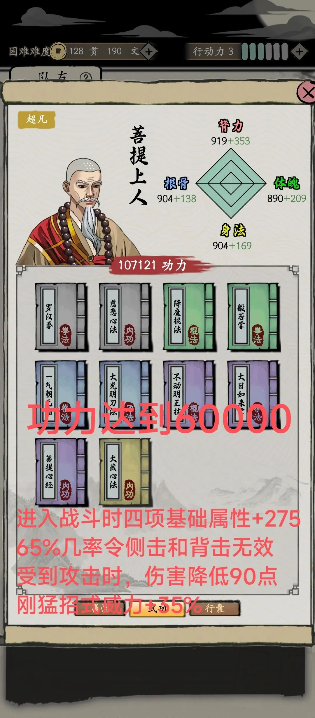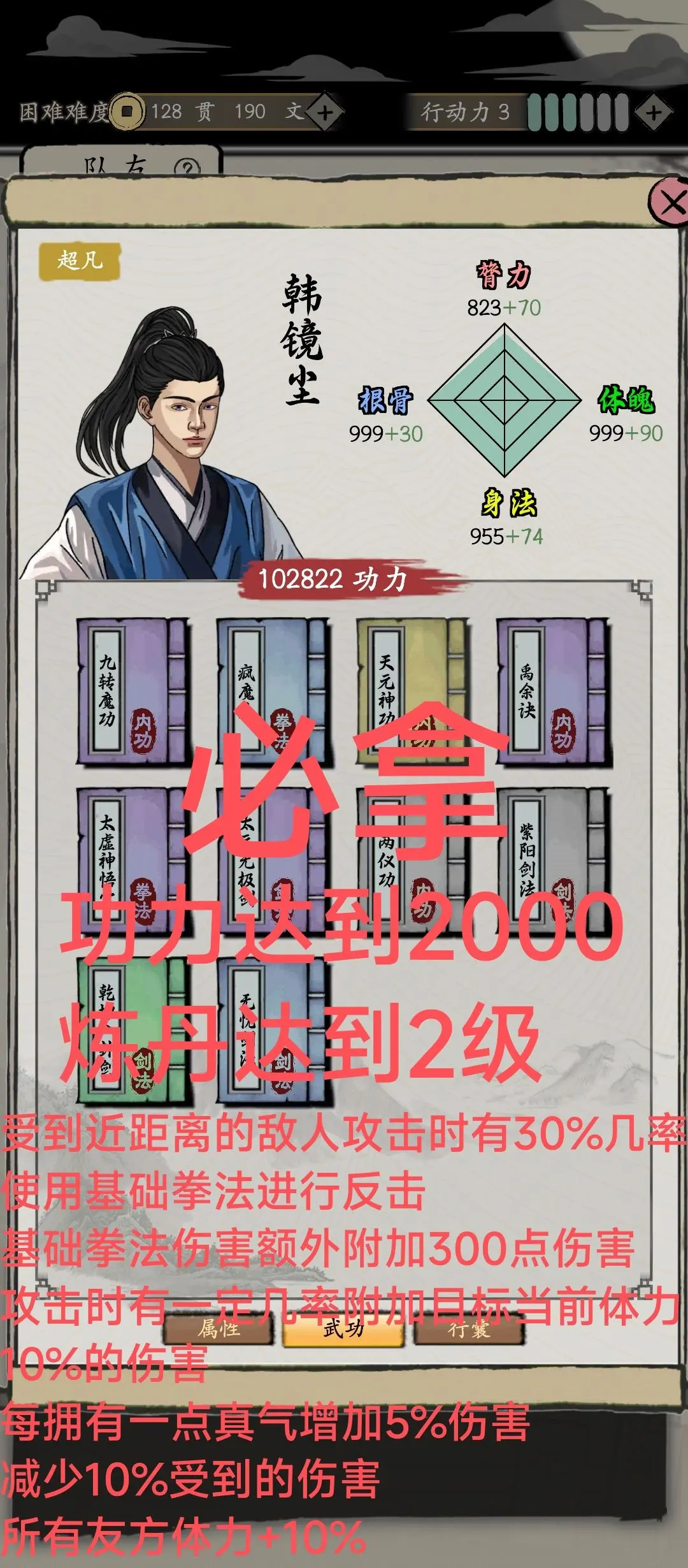 这个角色就好比是没了回血技能的强化版左丘子,由于解锁需要75点侠义值,所以不太建议选择。他的辅助强化效果来自玉衡七式,但实战中他未必会施展这套功法,反而有可能用天罡神拳来战斗。