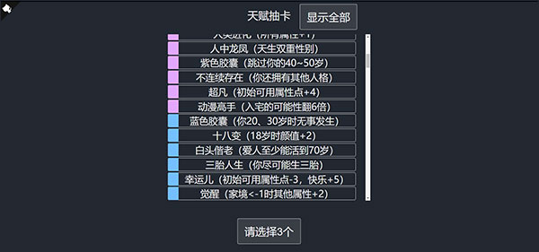 人生重开模拟器修仙版在开局时便允许玩家挑选十个天赋,并且能够反复重置,直至刷出自己满意的组合。游戏里的诸多剧情都需要特定天赋作为触发前提,要是缺少对应的前置天赋,就没办法在相应的时间节点解锁额外的选择分支。每一轮人生体验都会带来不一样的经历,即便开局不够理想,也未必不能收获好的结局。
