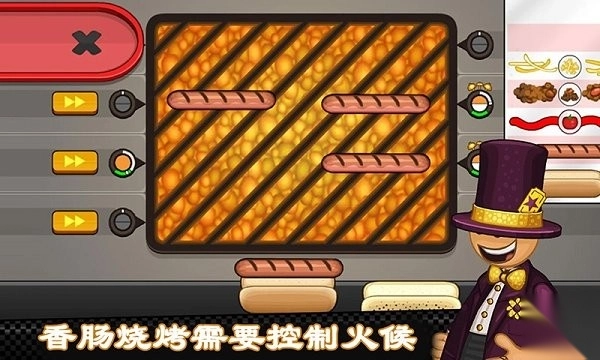把热狗放在烤炉上,留意左边指针的颜色,等指针变成橙色时就再次点击热狗翻面。(记得别让它烤焦了)
