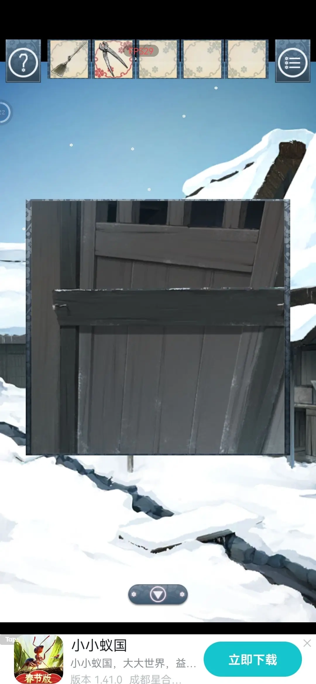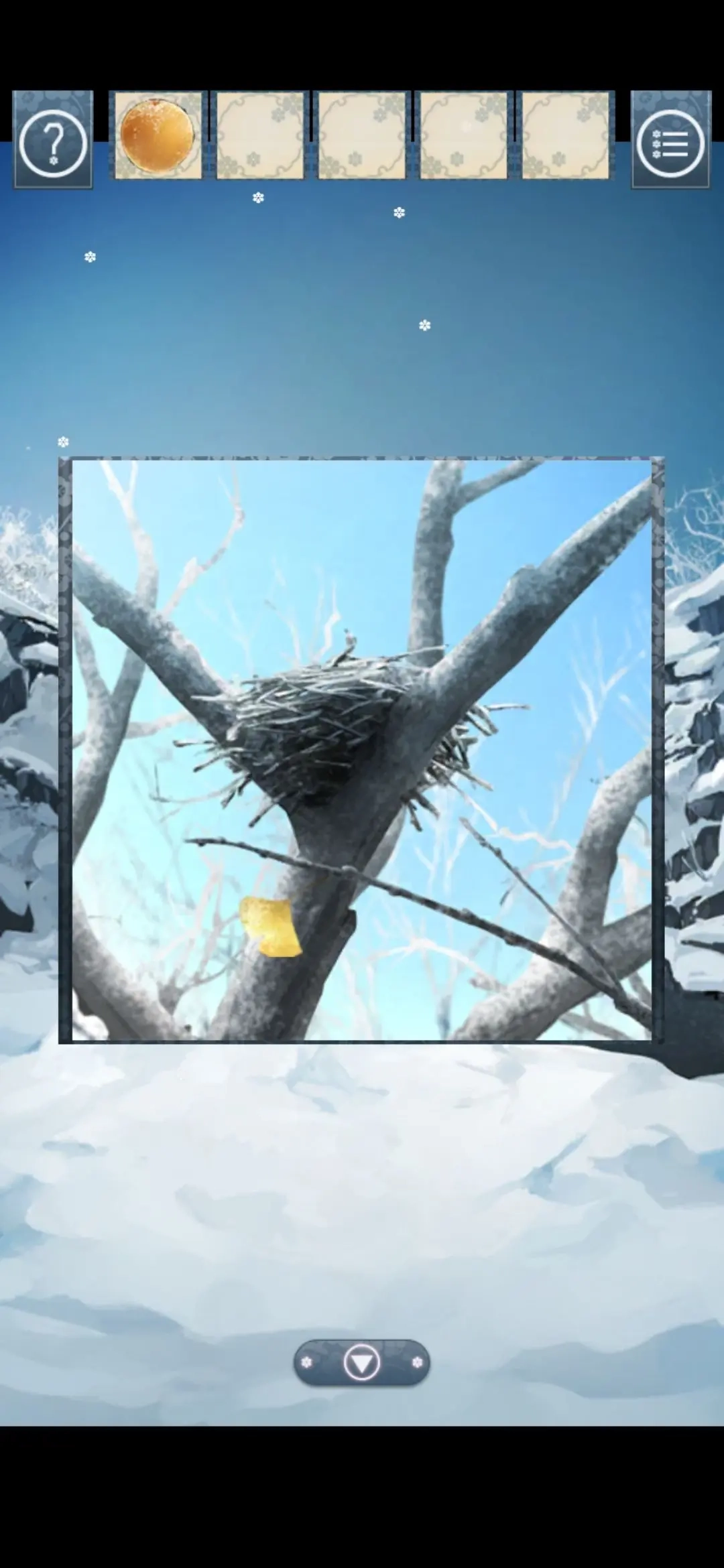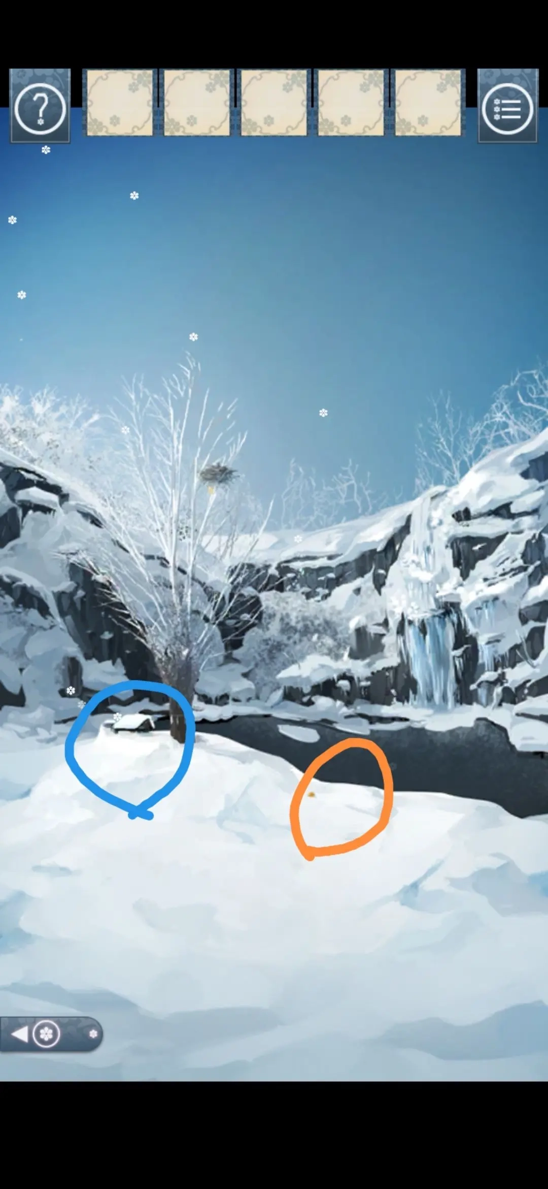 剧情正在推进中,一开始就看到地上和树上都有黄色的东西。捡起地上的那个,发现是果实(对应图片里的黄色区域);而树上的黄色东西,正是我们要找的叶子,可惜够不着。这时候注意到旁边蓝色区域的小房子,走近一看被雪盖着,得一层一层把雪点掉才行。
