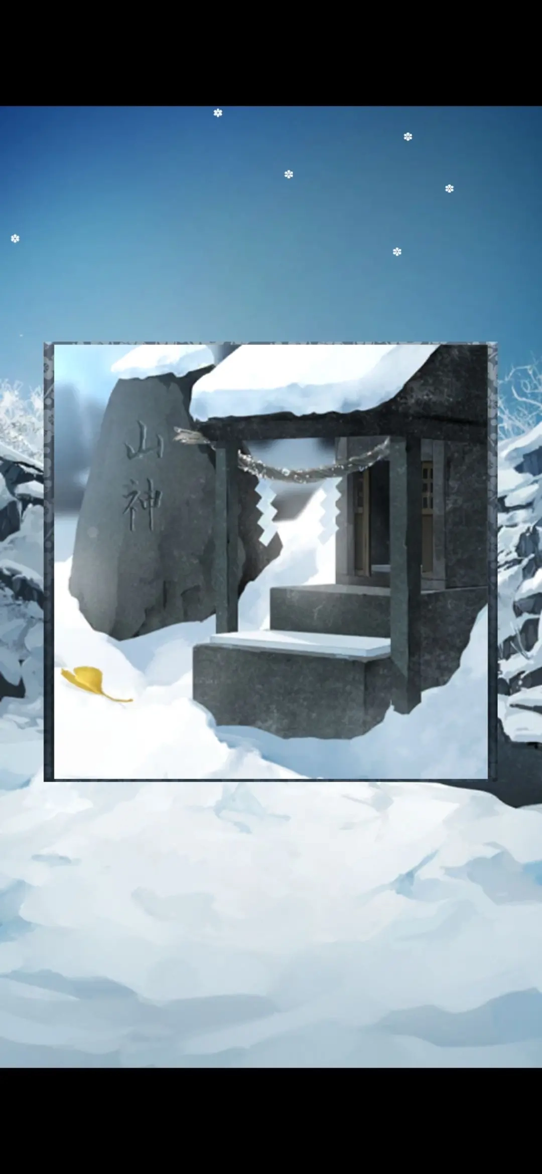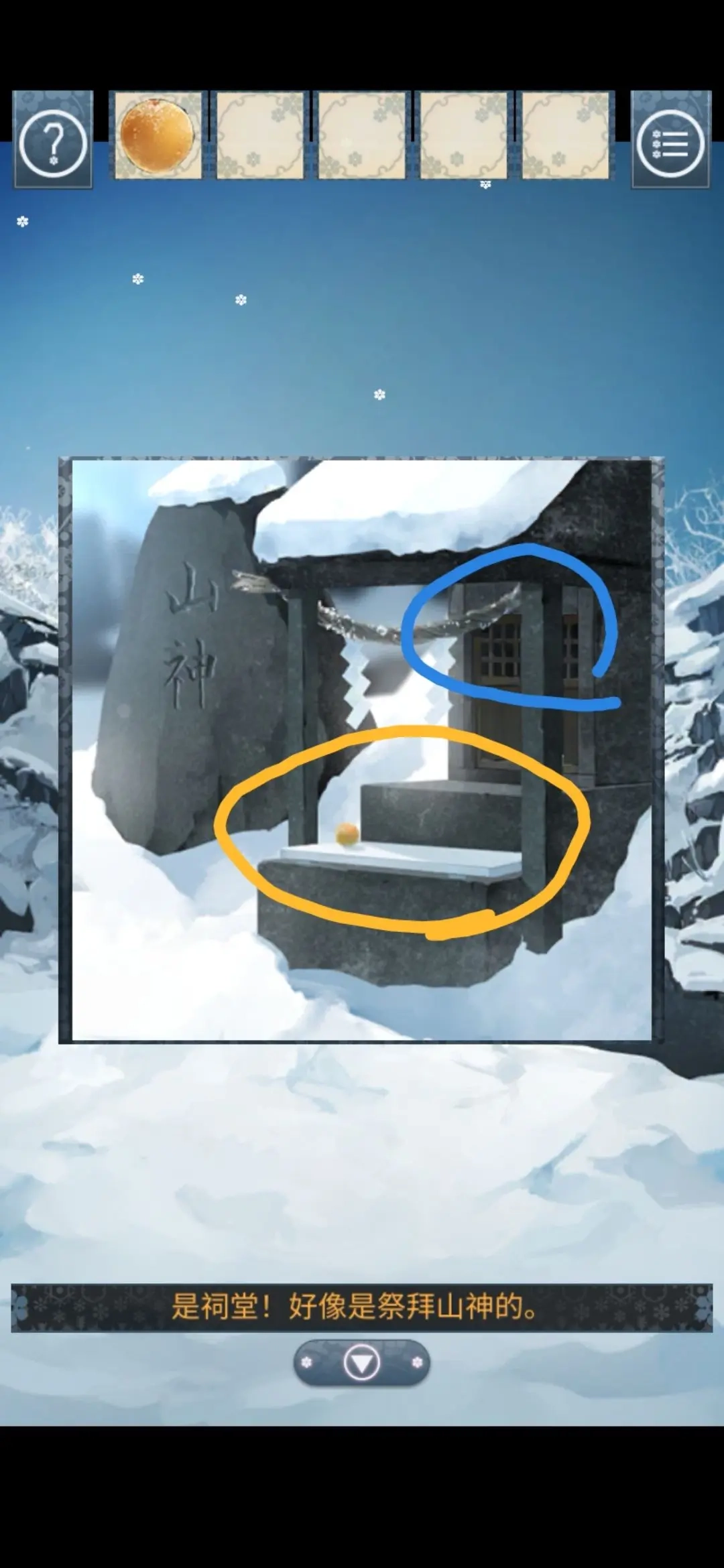 把所有积雪清理干净后,露出了一座祠堂,只是祠堂的门(蓝色区域)紧闭着。这时注意到石板上有个黄色的果实(黄色区域),需要将之前得到的果实放置在这个位置。