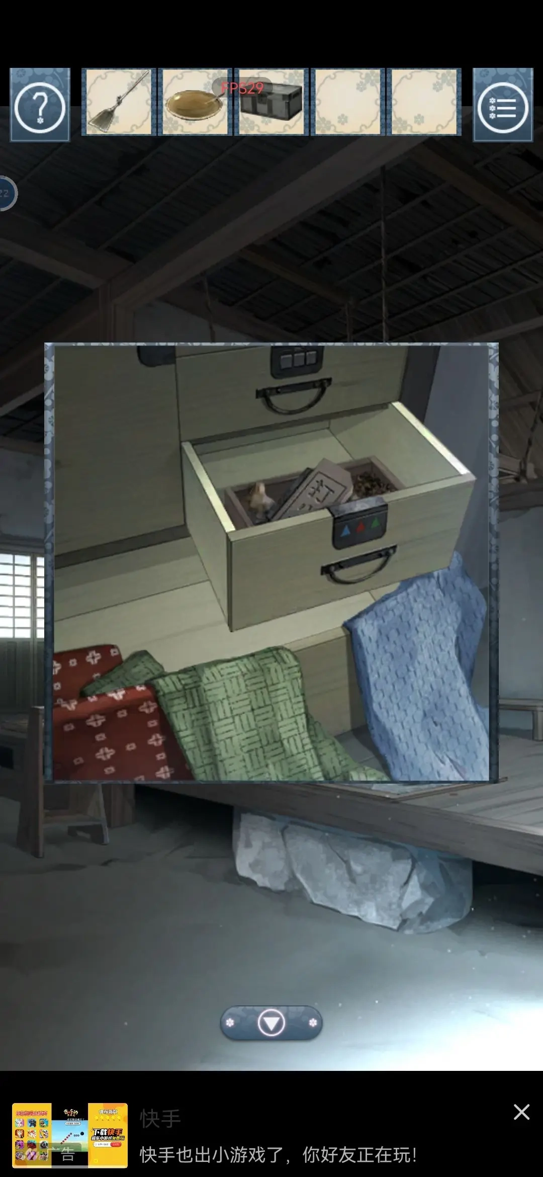 5 用拨火棍把床上的灰拨开,得到钱箱。