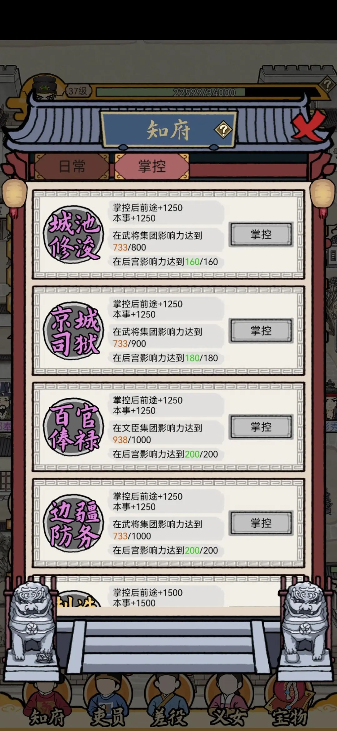 美女可分为家室和义女两类。家室的品质无论是红色还是橙色,影响其实都不大,不必过于纠结;但义女建议尽量刷到完美品质,若无法达到,要么放弃要么用500碎银进行援助。需要注意的是,朝廷掌控力对后宫的最高要求仅为600,而每个一品贵妃能增加81点掌控力,这意味着只需培养10个二品贵妃或8个一品贵妃就能满足需求。由于一品贵妃总共只有12个,所以义女不必急于多收,慢慢挑选即可。