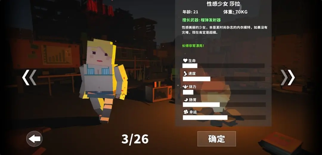 70公斤的美女,呵呵!速度和饱食都比较可观,但是耐力不行,跑个10秒就跑不动了,带榴单发射器暴击翻倍,喜欢杠怪的可以选择