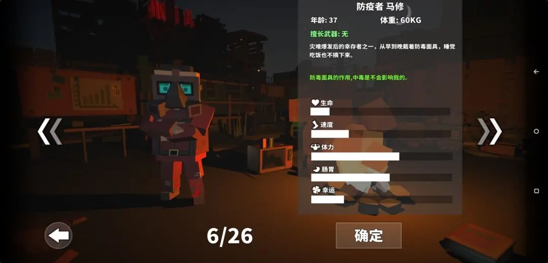 防疫者这个角色挺不错的,体力充沛还耐饿,移动速度处于中等水平。它不会受到毒buff的伤害,但被毒攻击命中时,还是会承受少量的攻击伤害,并非完全免疫毒怪的所有伤害,整体而言是个比较好用的角色。