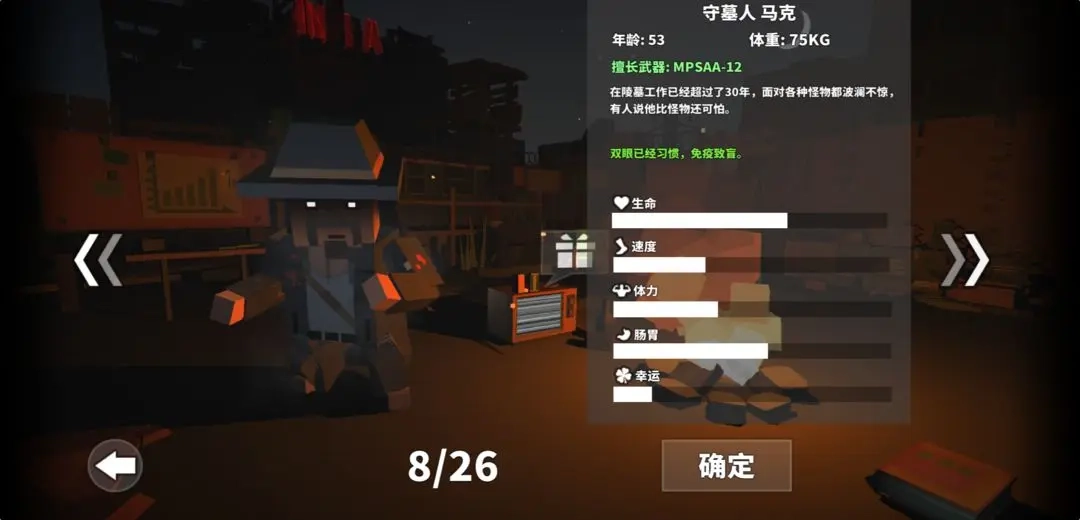 守墓人属于T1级别的角色,他有着高生命值和高饱食度的优势,速度与体力也相当可观。他的本命武器AA-12是游戏中期的强力杀器之一,被动技能能够让他免疫致盲效果,不过即便如此,他依然会受到伤害。如果在居民区生存时担心饿死,选择这个角色会是个不错的决定,他确实是个非常好用的人物。
