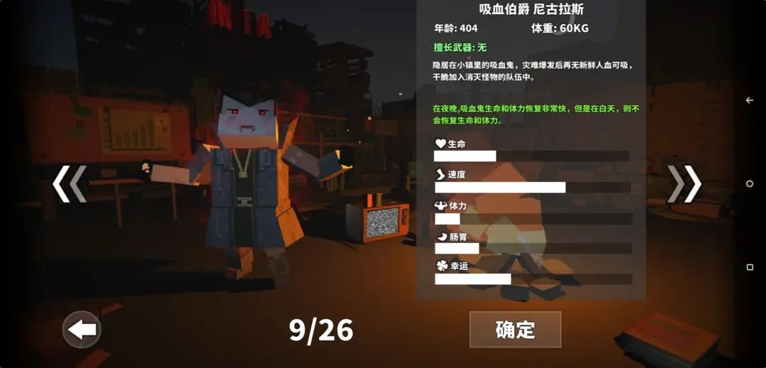 吸血鬼是T0级别的强力角色,它的速度优势极为突出——日常移动时就比绝大多数丧尸要快,进入快速移动状态时甚至不能用“跑”来形容,更像是一种轻盈流畅的“快飘”,操作手感非常丝滑,能帮你轻松规避掉很多敌人的技能。到了夜晚,它的耐力和生命值回复速度会大幅提升,还能依靠快飘快速赶路,因此深受多数玩家喜爱。虽然它的基础生命值偏低,但凭借极快的速度很难被敌人命中;不过缺点也很明显,饱食度上限不高,很容易陷入饥饿状态。