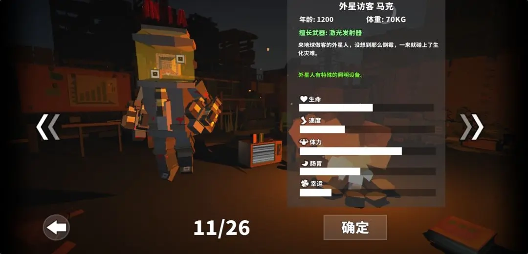 外星大哥,高生命高体力高饱食,速度中等,看起来是个相当厉害的角色,尤其是被动技能,还拥有特殊的照明方式呢!